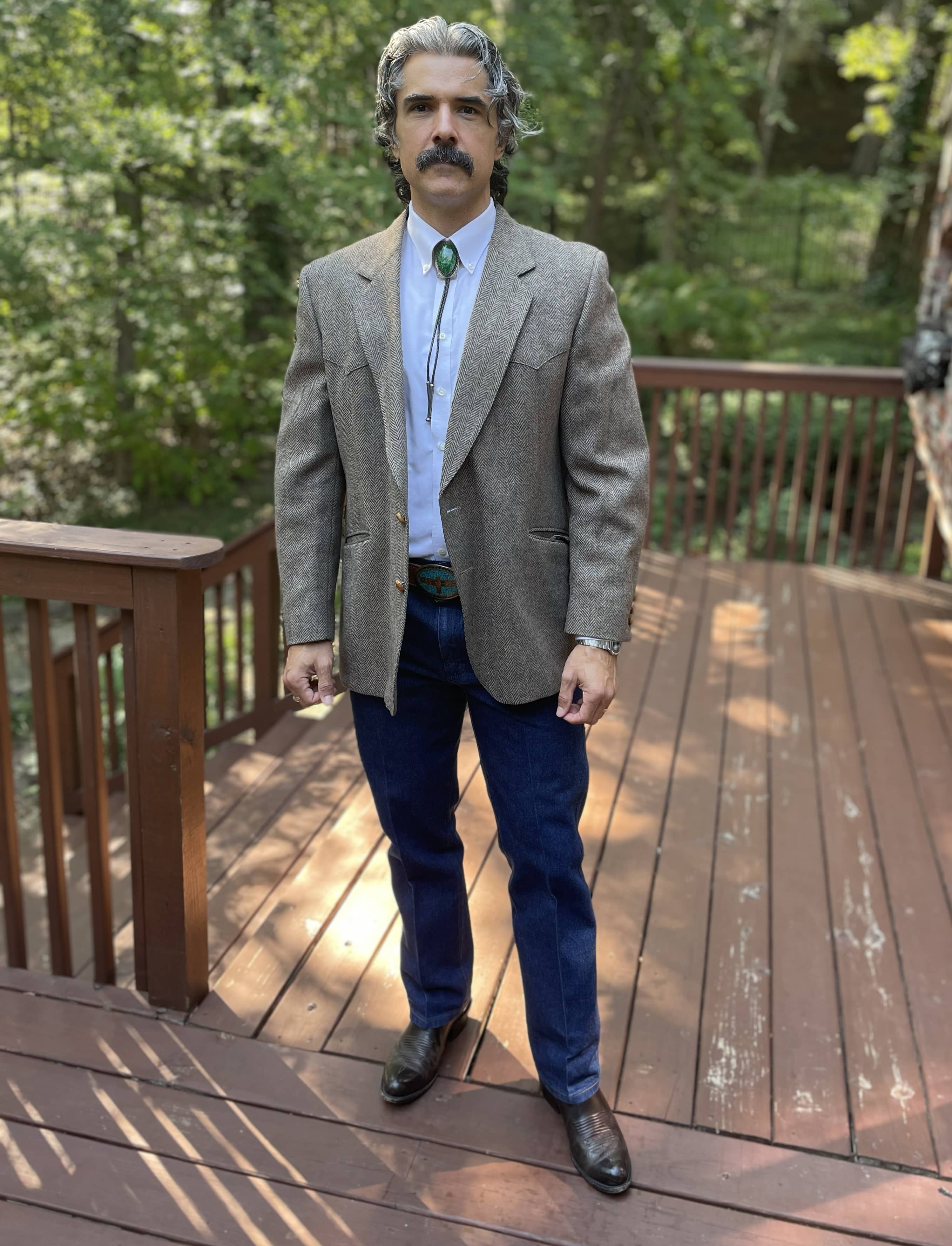 Sporting my Grandpa Bill Hurst’s Western sport coat and bolo tie. Great for Sunday church services or when you’re solving a murder in a Cormac McCarthy novel.