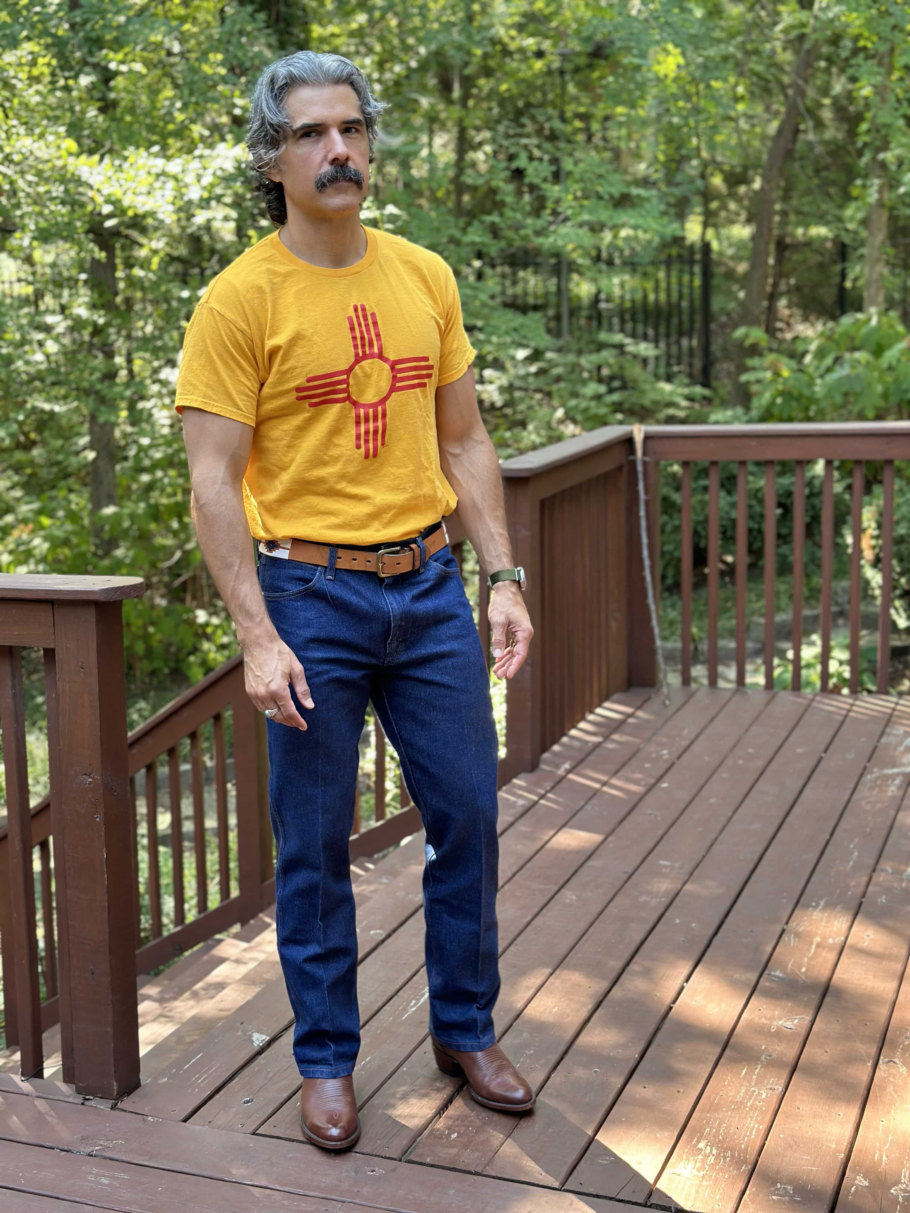 Repping my New Mexican heritage with the yellow Zia red sun t-shirt. Tucked-in, natch. Cowboy belt from Zilker.