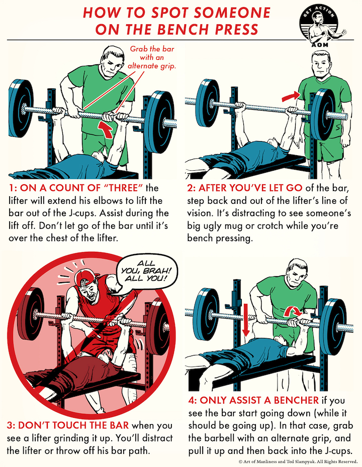 The problem with using a spotter on the bench press is that pretty much everyone does it wrong. Amateur and well-meaning spotters are so focused on making sure the barbell doesn’t kill the lifter, that they get in the way of the lifter performing the lift correctly. The typical gym-bro bench spotter will distractingly hover over the lifter’s head and place their hands close to the bar so that they’re ready to assist the moment they see the lifter seem to struggle. Worse, they’ll touch the bar while the lifter is struggling to push it upwards. That just messes up the bar path, and in assuming some of the effort of the exercise, deprives the lifter of the benefit of completing what could have been a successful, albeit grindy lift.
