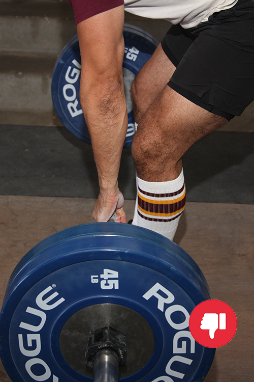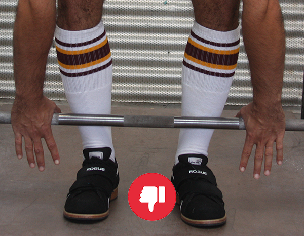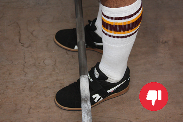 Don’t stand so close to the bar that your shins touch it. This will 1) result in the bar not being over your midfoot, and 2) throw off the rest of your deadlift setup.