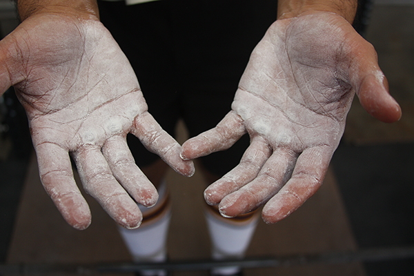 If your hands get excessively sweaty, even with chalk, try wearing sweatbands on your wrists; they’ll catch the sweat that would otherwise run down from your arms and onto your palms.