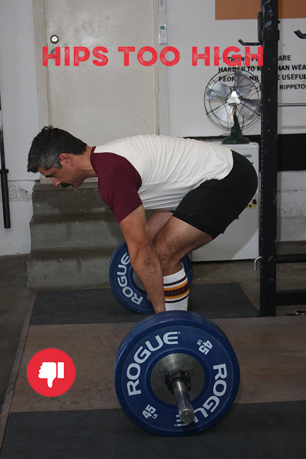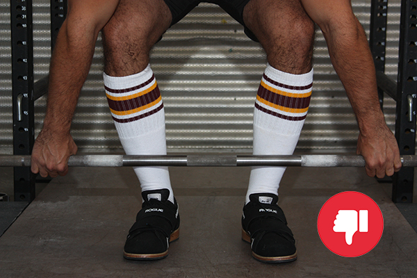 Your hips should not move from here on out. Very likely, you will feel like your hips are too high. Perhaps the most common mistake people make when deadlifting is to drop their hips and turn a deadlift into a squat with the bar in their hands. People do this because it’s easier to get your lower back into proper extension with your hips lower. But pause for a moment and consider the position that will put you in: You’ve placed your feet under the bar, taken your grip, and bent your knees so that they are just touching the bar. From this position, if you lower your hips, you must bend your knees, and bending your knees will cause the bar to roll forward, essentially undoing the first part of this setup and setting yourself up for an inefficient and unsafe lift.