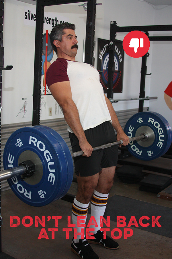 Make sure you maintain contact between the bar and your legs all the way up. Imagine you are trying to grab the hem of your shorts with the barbell. If you did everything else correctly, this contact ensures the bar is traveling in the most efficient path possible. It is a mistake, however, to bend the knees, creating a ramp out of your thighs. It is cheating in powerlifting to rest the bar there or to try to jerk and hitch the bar up your legs.