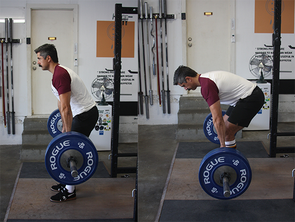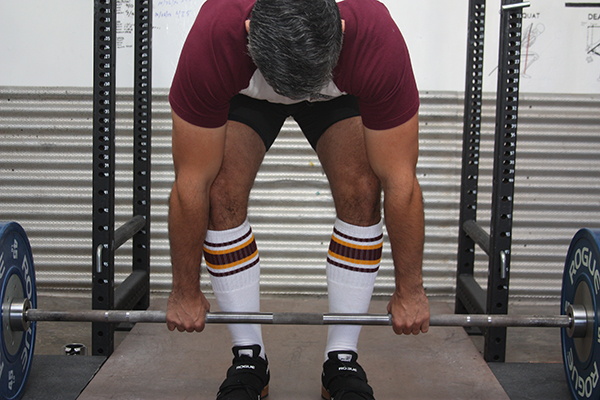 To start each repetition, you push with your feet. This may seem contradictory to our emphasis on the deadlift as a back and hip dominant exercise. But if you are also maintaining a rigid back and hip angle as you push with your feet, this push will not only extend the knees, but initiate the powerful hip extension needed to complete the lift.