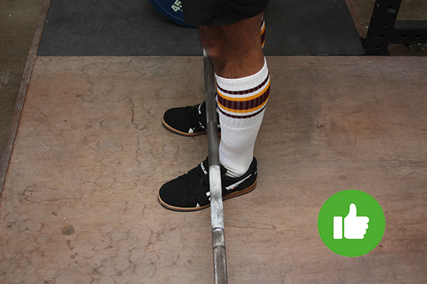 For a visual reference, the middle of your whole foot is about an inch from your vertical shins or directly over the knot of your shoes. To ensure the barbell is in the middle of your feet, just stand so that the barbell is about an inch from your shins. Here’s what that looks like: