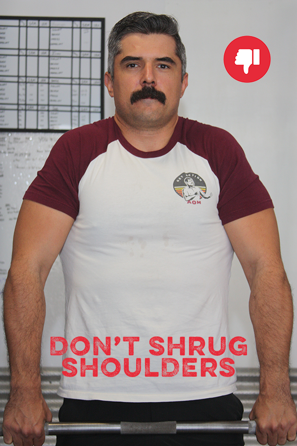 Some instructionals have suggested you should either retract your shoulder blades during the setup or that you should shrug or roll your shoulders back to finish the deadlift at the top of the movement. This is incorrect. A shoulder retraction will be immediately pulled out of place by the weight of the barbell hanging from your scapulae. At the top, you should be standing tall with no need to actively set your shoulders in any position.
