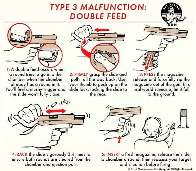 The remedy for a Type 3 malfunction is more involved than tap, rack, bang. The extra steps are necessary because there’s pressure built up from the round trying to enter an already occupied chamber, which can cause the magazine to stick.