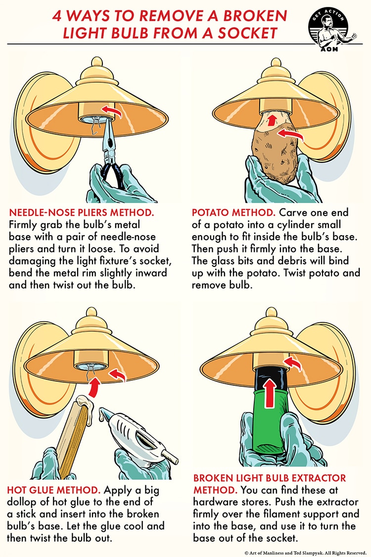One of the problems you can encounter with incandescent light bulbs is that when the glass bulb breaks, they’re hard to get out of the socket. But with a bit of ingenuity, you can easily take care of this job.