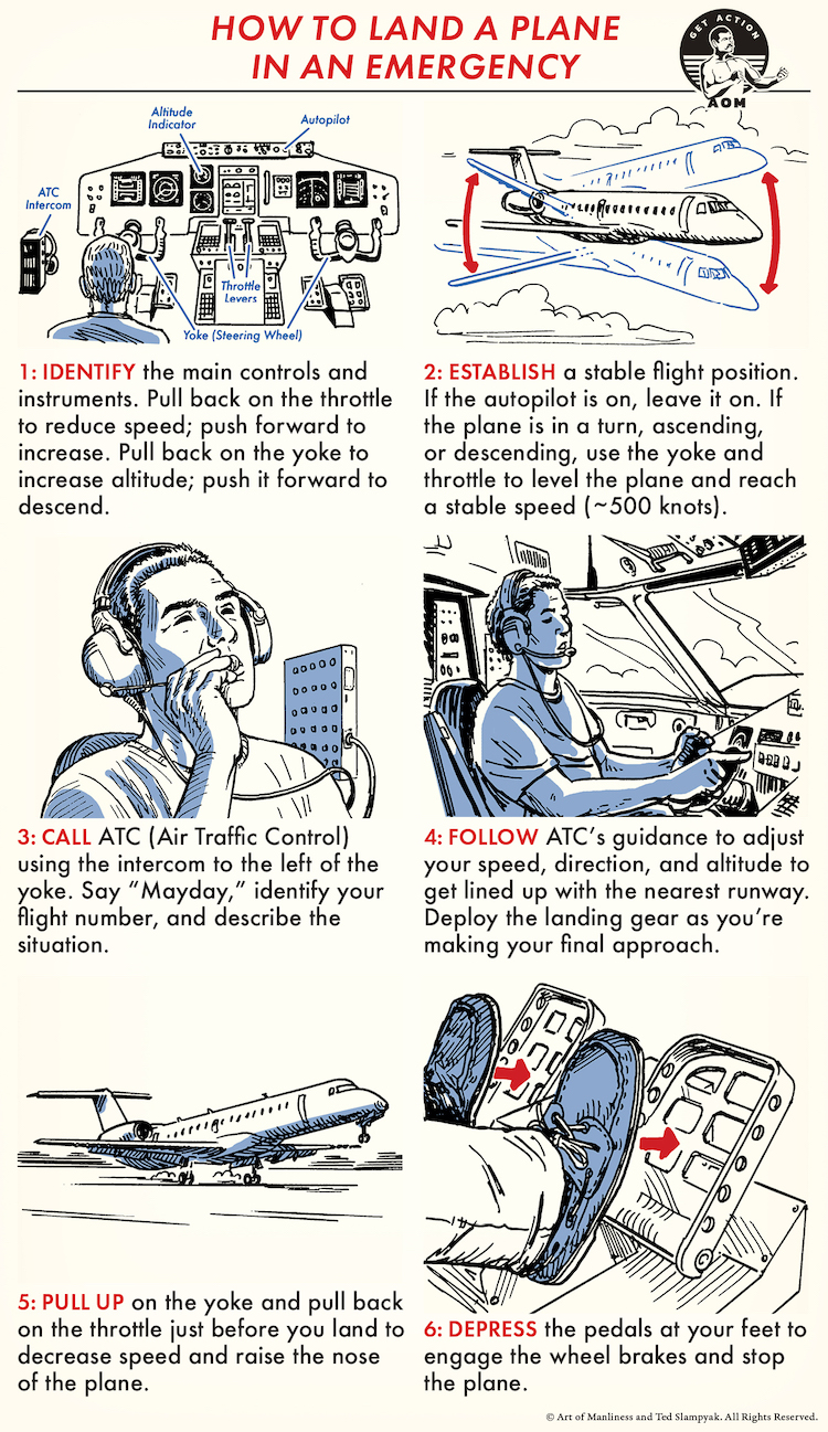 Whether you’re flying on a small plane on which the pilot has become incapacitated, or you’re a passenger on a commercial airliner and have taken out a terrorist, who took out the pilot, having a rough idea of what to do next will help you have that same calm and confident attitude. While autopilot systems will be able to do a lot of of the work for you, landing a plane still requires a manual touch and a cool head. So keep the above in mind as you take control of the aircraft and seek to bring her safely back to earth.
