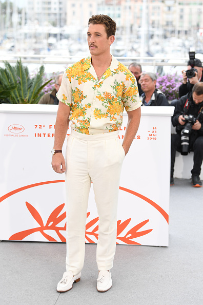 Miles Teller in a floral camp shirt, tucked into white linen trousers, and paired with tassel loafers. Notice the vintage Omega watch too; a few cool-guy accessories can complete your camp shirt get-up (Teller was also wearing a signet ring), but since you may already have a lot going on with the pattern of your top, keep them simple and sharp. An all-around bold look here? Sure. But fly as heck. Good work, Goose, Jr.