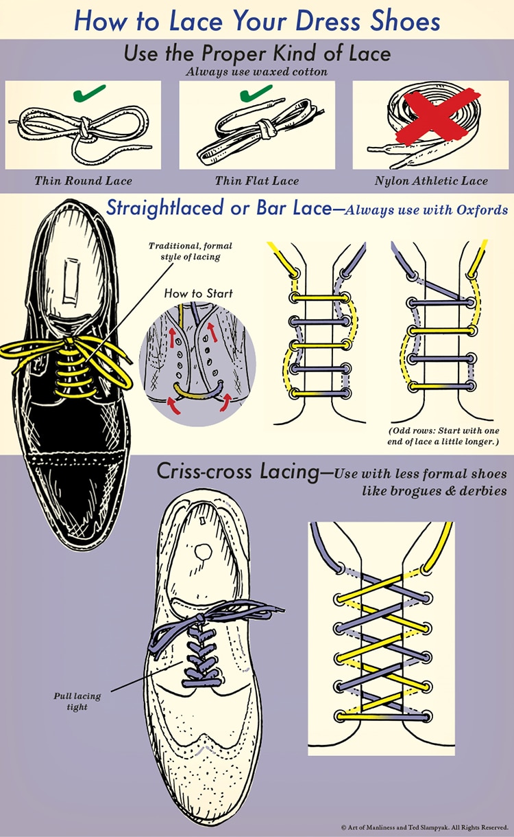 In the list of priorities on how to dress well, your shoe laces should be near the bottom. Take care of the style fundamentals first. But once you’ve got those down and would like to add a bit more panache to your outfit, you can start thinking about the smaller details of style, like adding a dimple to your tie, and, as you’ll find illustrated above, lacing your dress shoes in what sartorialists consider the proper fashion.