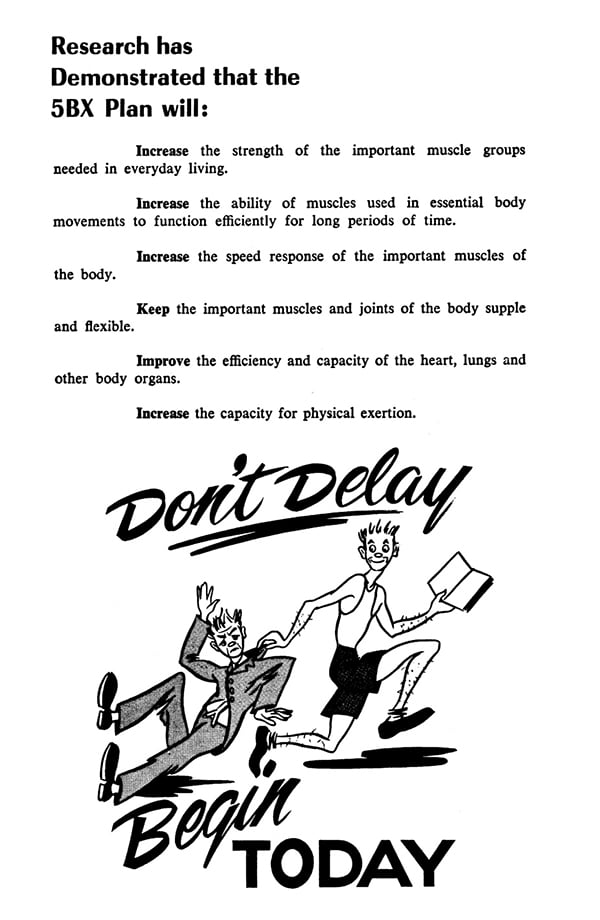 If you’d like to try it out, we’ve reformatted and republished the 5BX plan below. It features six “charts,” each of which includes the program’s five main exercises: