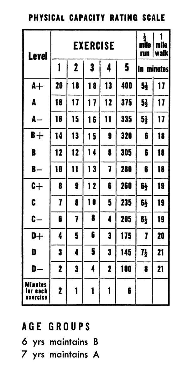 Each age group is given a Physical Capacity level to attain; that is, a goal which they should try to reach.