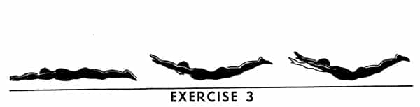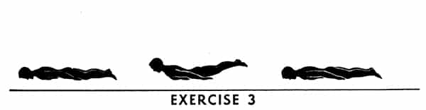 Front lying, arms extended over head. Raise arms, head, chest, and both legs as high as possible then press back once. Keep legs and arms straight — chest and both thighs completely off floor.