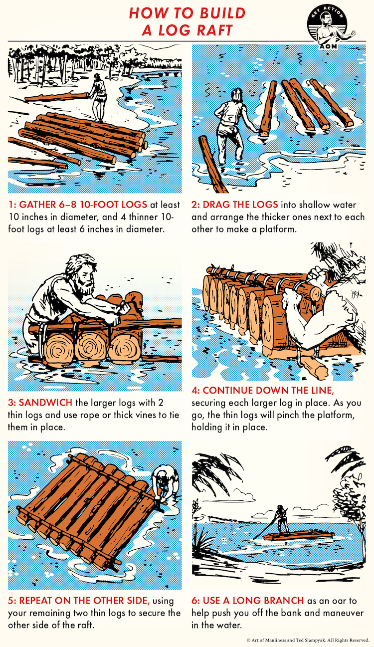 Whether you want to recreate Huck Finn’s meander down the Mississippi or a body of water stands between you and survival, log rafts can offer you safe passage when boats aren’t available. If possible, always use lighter-weight woods like pine and oak, and make sure your rope knots are as tight as possible to avoid shifting once you’re underway.