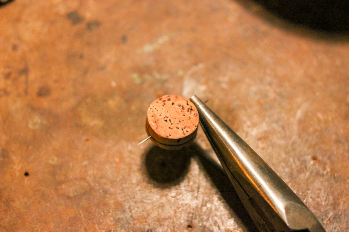 Push the needle through the edge of your cork disk and through the other side. You may want to use a pair of pliers for this part.