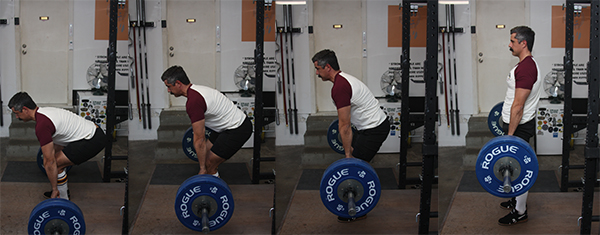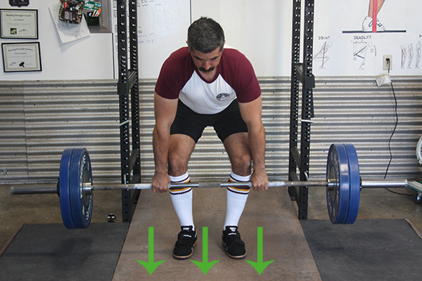To start each repetition, you push with your feet. This may seem contradictory to our emphasis on the deadlift as a back and hip dominant exercise. But if you are also maintaining a rigid back and hip angle as you push with your feet, this push will not only extend the knees, but initiate the powerful hip extension needed to complete the lift.