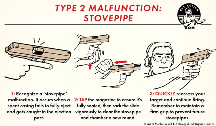 A Type 2 malfunction occurs when an empty casing gets stuck in the ejection port, which prevents a new round from being chambered. The spent casing kind of looks like a stovepipe sticking out of your ejection port, so this type of malfunction is often called a “stovepipe” malfunction. The telltale symptoms of a stovepipe malfunction are a mushy trigger and the lack of the gun going “bang.”