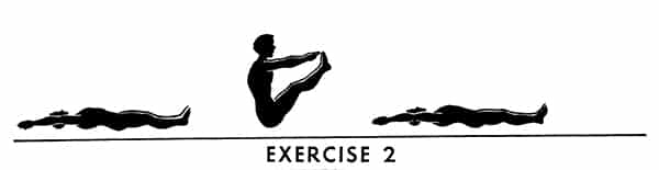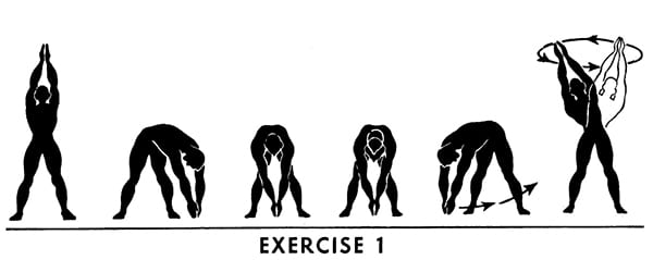 Let us see how this principle applies to exercise No. 1, which requires you to touch the floor. You should not force yourself to do it on the first attempt, but rather start by pushing down very gently and slowly as far as you can without undue strain — then on each succeeding try push down a little harder, and, at the same time, do the exercise a little faster so that by the end of two minutes you are touching the floor and moving at the necessary speed. All the exercises can be performed in this manner.