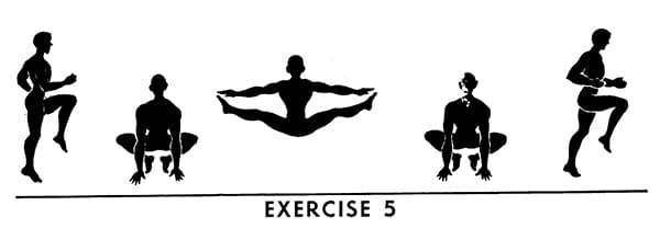 Semi-squat jumps. Drop to a half crouch position with hands on knees and arms straight, keep back as straight as possible, right foot slightly ahead of left. Jump to upright position with body straight and feet leaving floor. Reverse position of feet before landing. Return to half crouch position and repeat.